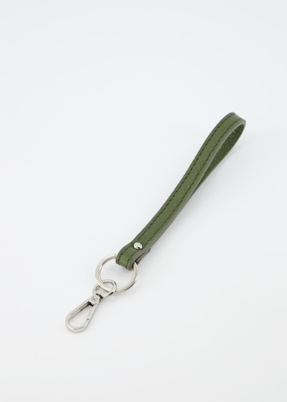 Sleutelhanger gemaakt van echt leer. De sleutelhanger is ook te bevestigen aan een tas of portemonnee en te gebruiken als een polsbandje. Verkrijgbaar in diverse kleuren.