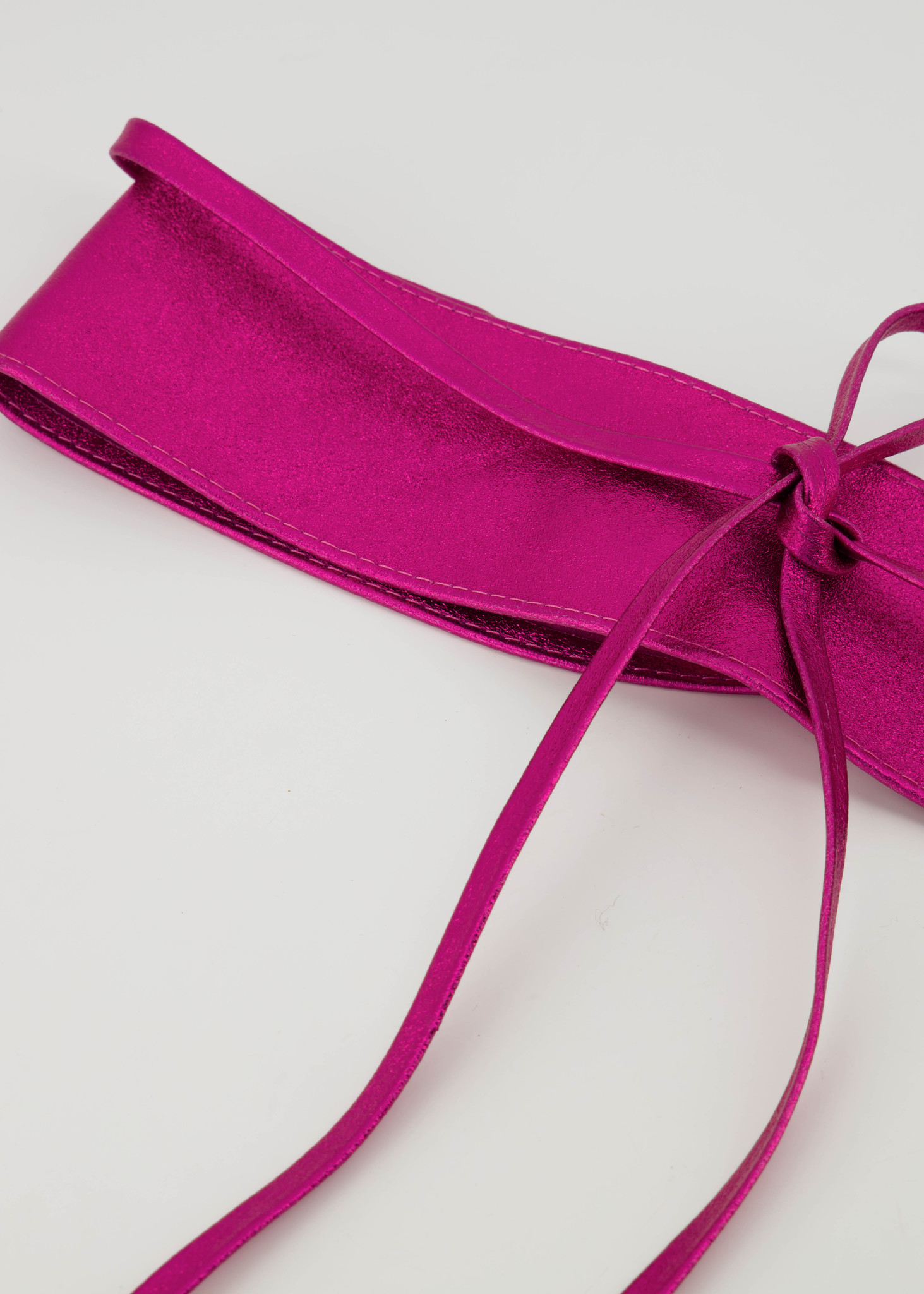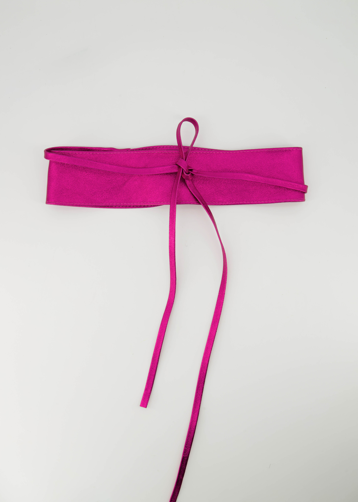 Lily is een leren wikkelriem in een metallic uitvoering. De riem is 8 cm breed en het taille gedeelte is 85 cm lang. Met de touwtjes kan de riem op een speelse manier om de taille geknoopt worden. De wikkelriem is verkrijgbaar in een maat.