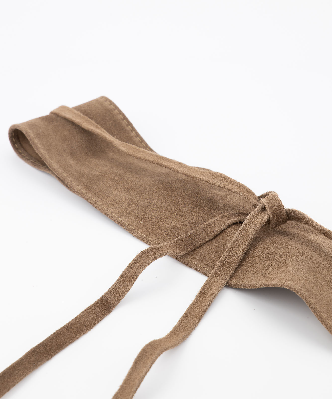 Suede leren wikkelriem met touwsluiting, verkrijgbaar in een maat. Brede gedeelte is 83 cm lang en de uiteindes zijn ieder 90 cm lang (Lengte kan hier en daar een beetje verschillen).